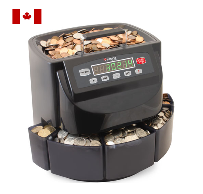 Counts and sorts Canadian .05, .10, .25, loonies and toonies