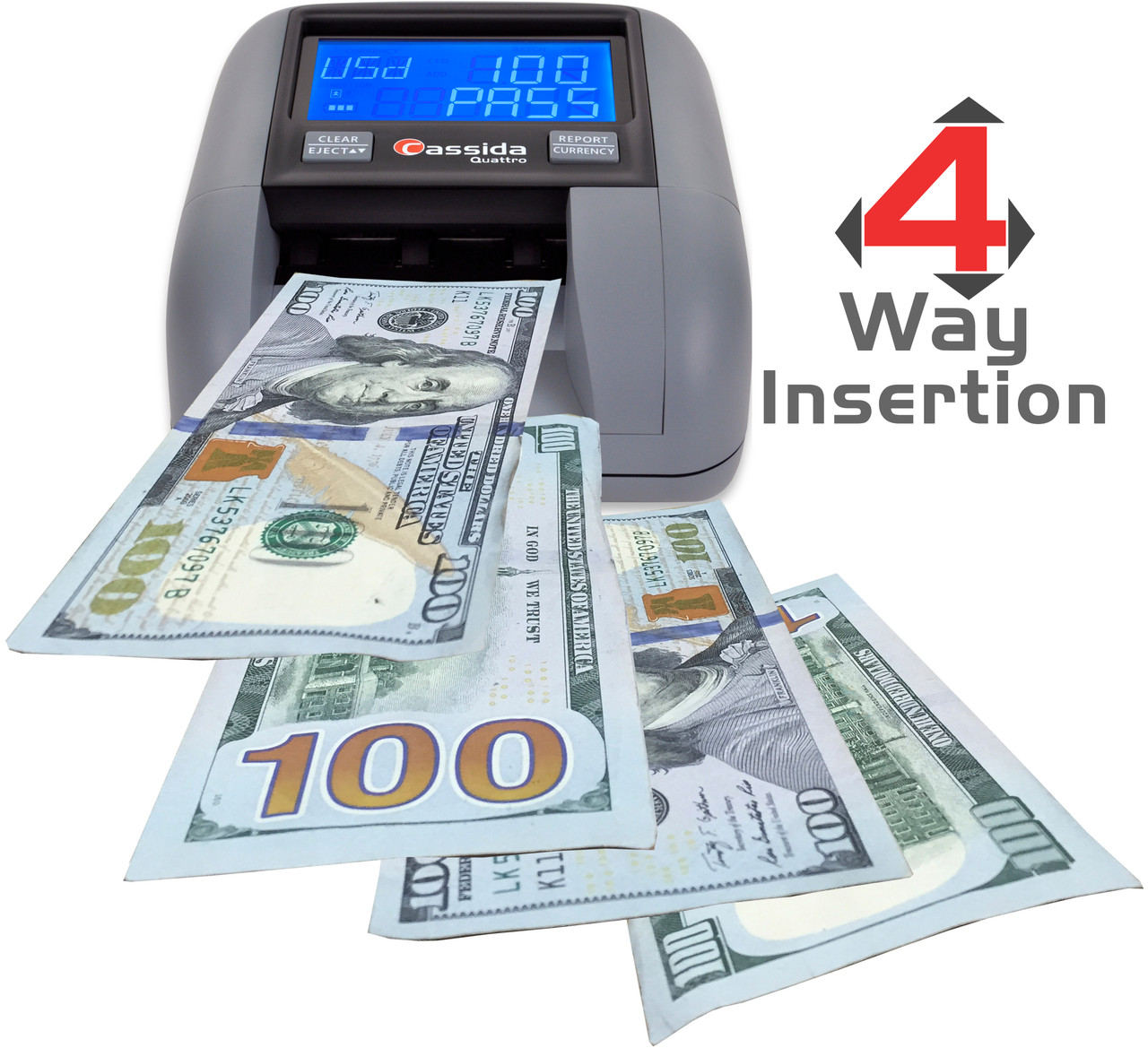 - Eliminate the frustration of having to insert bills only one particular way — unlike standard detectors, Quattro accepts bills in all 4 orientations — face up or face down