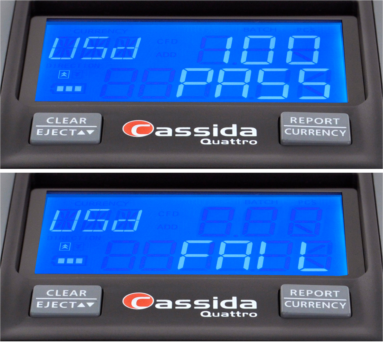 Cassida Quattro employs the most advanced technology in counterfeit detection today and eliminates the frustration of feeding bills correctly. The Quattro allows you to insert bills in any orientation – face up or face down – and instantly know whether a bill is genuine or suspect. Easy to understand PASS and FAIL indicators show if bills are legitimate or should be rejected.