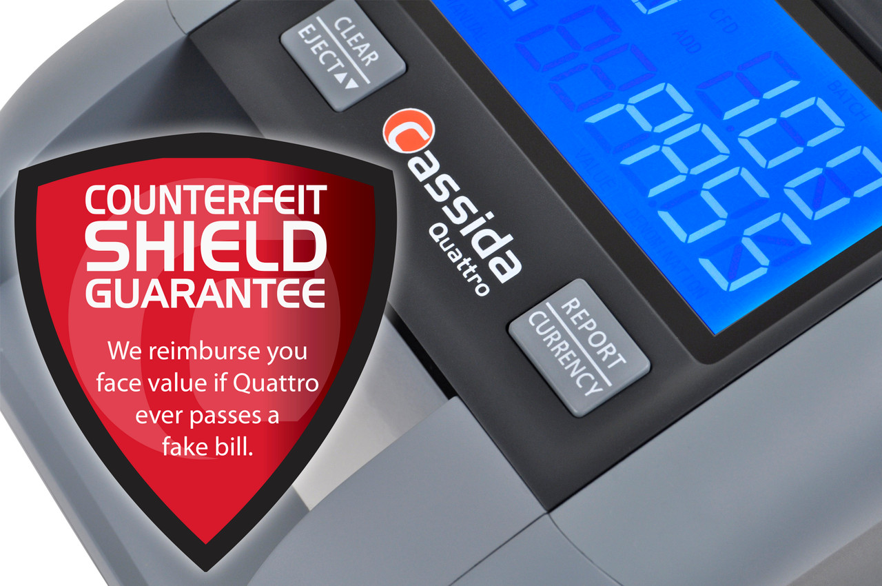 Quattro is backed by the exclusive Cassida Counterfeit Shield that reimburses you the full face value of the counterfeit bill within 72 hours, should your Quattro detector accept it as genuine. We’re so confident in the Quattro, because it has state-of-the-art detection built right in.