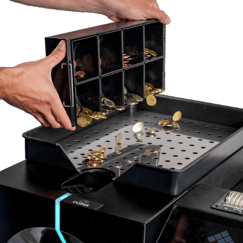 • Self-sealing stacking bag in overflow safe eliminates the need for cassettes and onsite de-cashing