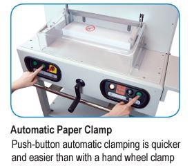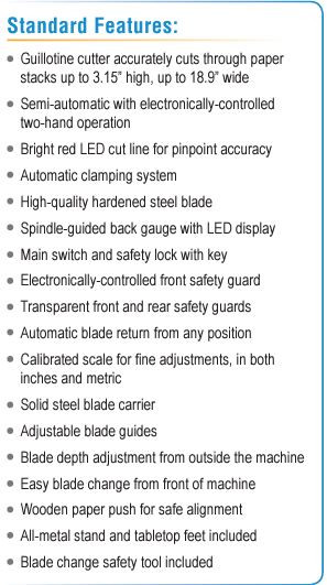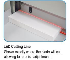 The Cut-True 27S Semi-Automatic Electric Paper Cutter offers precision cutting for paper stacks up to 18.9” wide. User-friendly features include dual-button electronic operation, automatic paper clamp, and LED digital readout. Simply load a stack of paper, up to 3.15” high and press the clamp and blade buttons to engage the hardened-steel Guillotine blade. These features, combined with the bright red LED Cutting Line, allow operators to make fine adjustments and see exactly where the blade will cut.