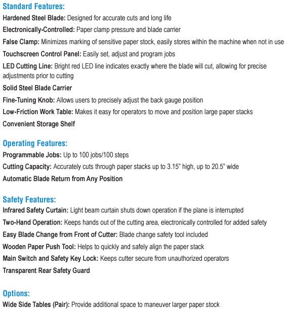 - Touchscreen Features: Program jobs, alternate between inches/mm, paper eject function, programming via cutting, business card cutting mode