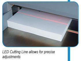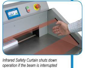 Operation is simple: utilize the touchscreen control panel to program and select job settings, then load a stack of paper, up to 3.15” high. Set the back gauge using the touchscreen. The bright LED Cutting Line allows operators to see exactly where the blade will cut and make fine adjustments. Electronically-controlled two-hand operation engages the hardened steel blade for crisp, accurate cuts, every time.