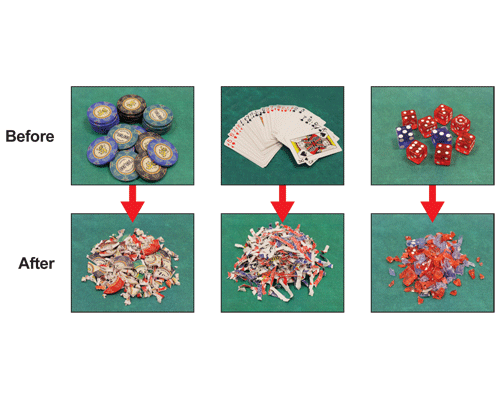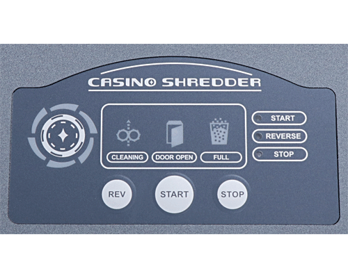 Solid-steel cutting blades and a heavy-duty motor shred entire decks of playing cards, multiple dice, casino chips, coins and gaming tokens. Simply open the enclosed shredding chamber, drop in the items and close the latch. Press Start on the LED Control Panel and watch through the clear plexi window as the blades shred each piece. Shredded particles are then collected in the rugged molded plastic waste bin for secure disposal.