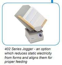 18” Conveyor with Photo Eye: Allows for neat and sequential stacking of processed forms Locking Cabinet: Fully enclosed for storage, with casters for easy mobility 402 Series Jogger: Reduces static electricity from forms and aligns them for proper feeding Reverse Stacking Conveyor: Allows for A-to-Z input and A-to-Z output.