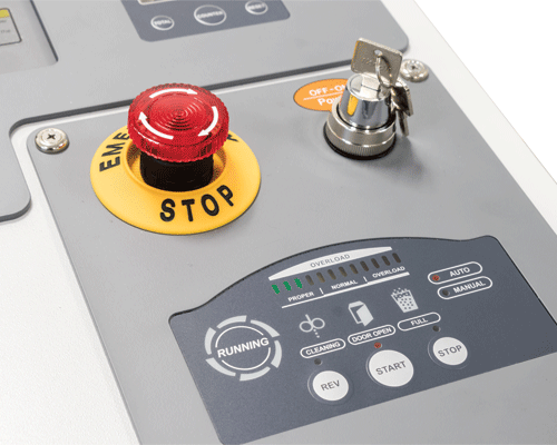 The LED control panel displays operational status and offers jam protection with Auto Reverse and Auto Stop. In addition, sensors stop the motor automatically if any of the doors are open or the waste bin is full. The powerful metal geared motor is housed in an all-metal cabinet with casters for mobility and is designed for low operational noise.