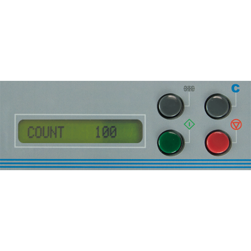 The LCD control panel includes a resettable 3-digit counter, and AutoBatch for processing a set number of sheets with a pause between sets. The built-in output conveyor features adjustable stacker wheels for neat, sequential stacking of folded pieces.