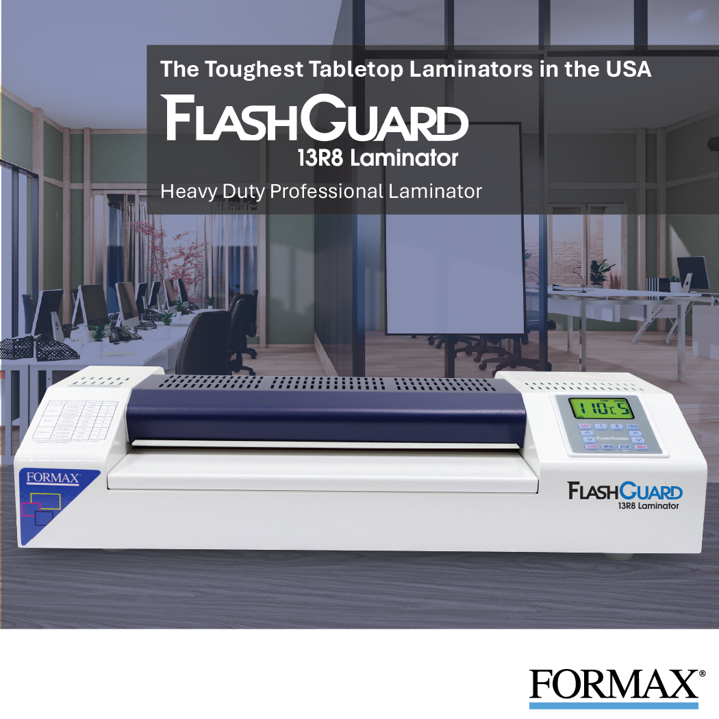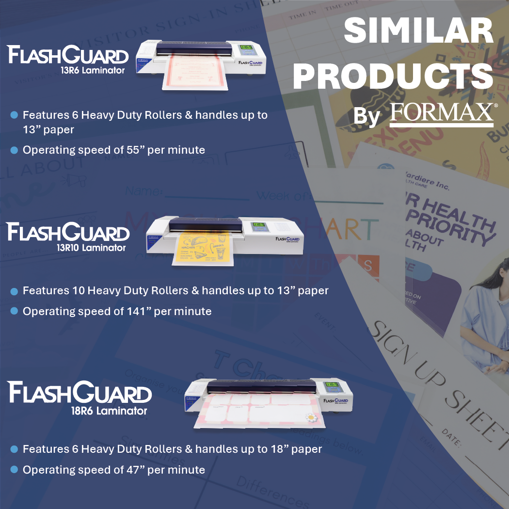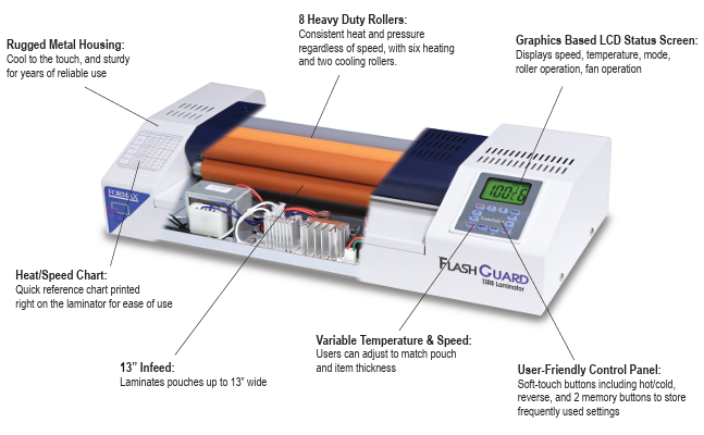 The FlashGuard 13R8 Heavy-Duty Laminator is ideal for print shops, schools, and corporate offices. With a rugged metal housing and user-friendly features, it easily laminates and protects photos, documents, signs, menus, IDs, and more.