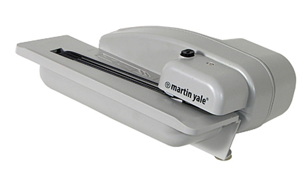 The Martin Yale 1632 is an automatic letter opener that is ideal for large businesses with moderate to high mail volume. It automatically feeds and opens a stack of envelopes up to 1.75” high, making it a hands-free operation. The machine operates at a speed of up to 7,000 envelopes per hour. The blades are fully enclosed to protect fingers. The catch tray folds for easy storage when not in use. It has non-skid feet to keep the machine in place.