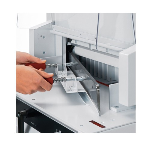 Ergonomic, 37 inch working height. Electric blade drive. Spindle-guided back gauge with calibrated crank. Front table digital display (cm or inches) for precise back gauge positioning. Bright, LED optical cutting line. Adjustable back gauge with narrow separations and plastic gliders. Manual spindle clamp is guided on both sides to apply even pressure along entire cutting width. Dual side guides on front and rear tables. High quality, German steel blade. Solid steel blade carrier and adjustable blade guides. All-metal construction. Includes stand with storage shelf, easy-access tool holder, and paper blocking tool. Optional side tables increase work surface. UL and C UL approved.